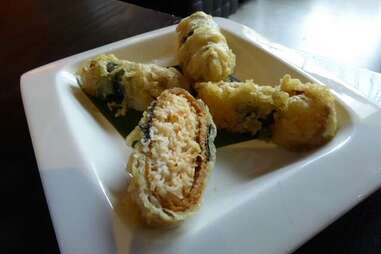 In addition to having the most scandalous name, this small plate is easily the most exotic on this list: spicy crab is stuffed into aged tofu shells that are then wrapped in a strip of sushi seaweed. Then the whole shebang is tempura batter-coated and deep-fried. The result is a sweet-savory union that makes for a light snack and begs for an unfiltered sake.